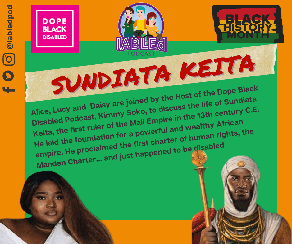 Alice, Lucy and Daisy are joined by the Host of the Dope Black Disabled Podcast, Kimmy Soko, to discuss the life of Sundiata Keita, the first ruler of the Mali Empire in the 13th century C.E. He laid the foundation for a powerful and wealthy African empire. He proclaimed the first charter of human rights, the Manden Charter… and just happened to be disabled